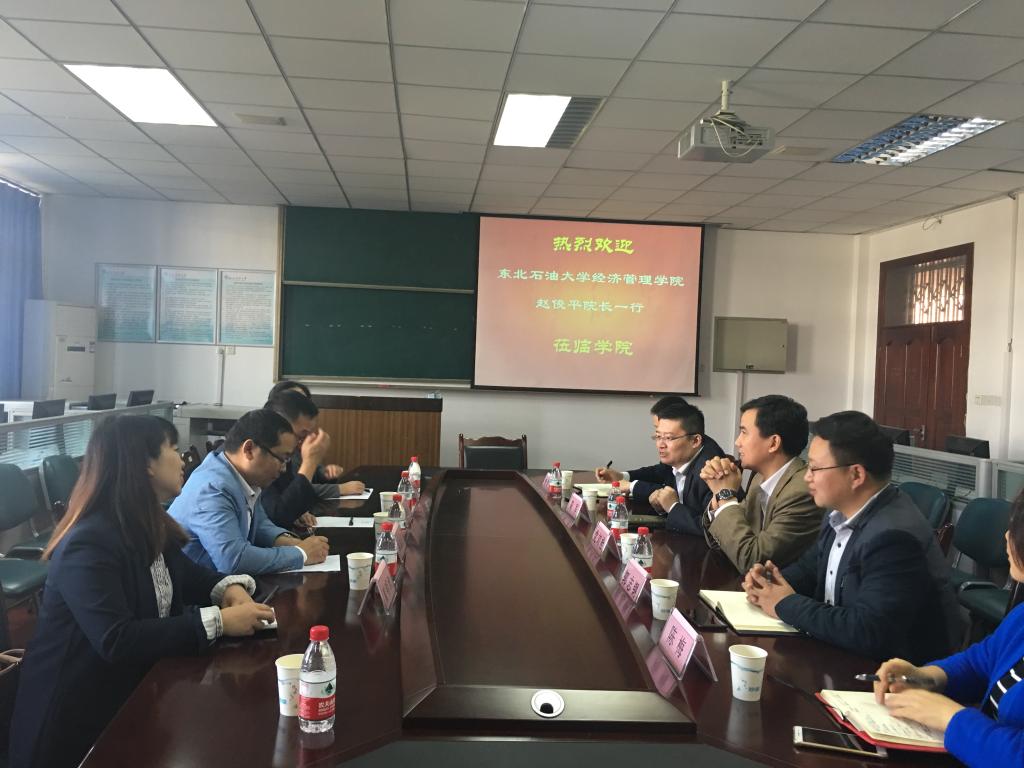 2018年10月26日下午,東北石油大學經濟管理學院趙俊平院長、林向義副院長一行四人到我院進行訪問交流。學院黨委書記黨劉栓、院長高軍、副書記曾有為、副院長郭志鋼、教學辦公室主任陳梅等接待了趙院長一行四人。