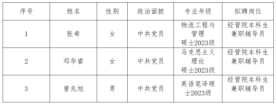 根據(jù)《經(jīng)濟(jì)管理學(xué)院關(guān)于公開招聘兼職輔導(dǎo)員的通知》要求,經(jīng)本人報名、資格審查、面試考核等程序,現(xiàn)將經(jīng)濟(jì)管理學(xué)院兼職輔導(dǎo)員擬聘用人員公示如下: