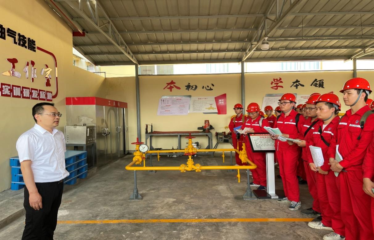 工作組首先走訪了雷一1總站與磨深1井,現場考察了實習環境、教學條件、日程安排等具體內容,深入了解了川中企業特色文化,并與現場專家及企業領導進行交流。張智對實習單位一直以來對我校人才培養涉及的教育教學、實習工作的支持表示感謝。工作組詳細詢問了同學們的實習狀況,認真聽取了同學們的實習體會,深入了解了同學們在實習過程中遇到的困難和問題。張智以羅平亞院士工作實踐事跡為例,鼓勵同學們在實習期間,要互相團結、幫助,常懷感恩,充分利用好實習平臺,將所學知識與具體崗位工作結合起來,不斷錘煉自己的專業技能,真正做到學有所獲、學有所成,為將來走向職業崗位奠定基礎。時值高溫天氣,他還再三囑咐同學們一定要多喝水,防止中暑,并帶好藿香正氣液等藥品以備不時之需。