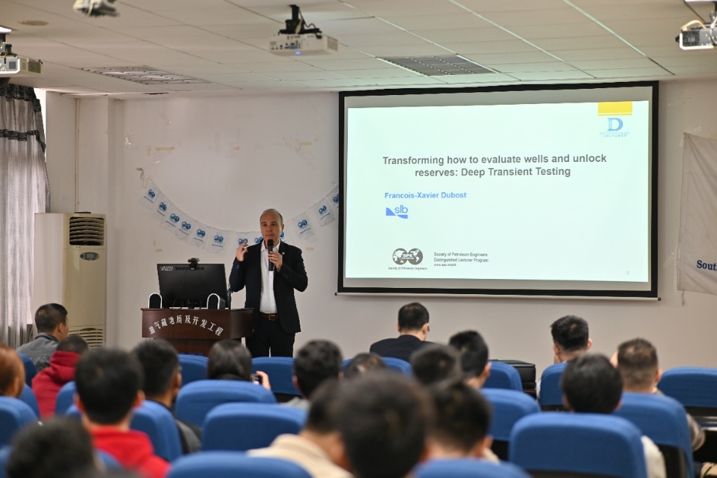 10月9日上午,斯倫貝謝(SLB)油藏團(tuán)隊(duì)技術(shù)總監(jiān)Francois-Xavier Dubost受邀在國(guó)重A403學(xué)術(shù)報(bào)告廳作了題為《Transforming how to evaluate wells and unlock reserves: Deep Transient Testing》的學(xué)術(shù)報(bào)告。本次講座由油氣藏地質(zhì)及開(kāi)發(fā)工程全國(guó)重點(diǎn)實(shí)驗(yàn)室、石油與天然氣工程學(xué)院和SPE成都分部聯(lián)合主辦。報(bào)告會(huì)由石工院曾杰副研究員主持,學(xué)院留學(xué)生和碩博士研究生百余人參會(huì)。