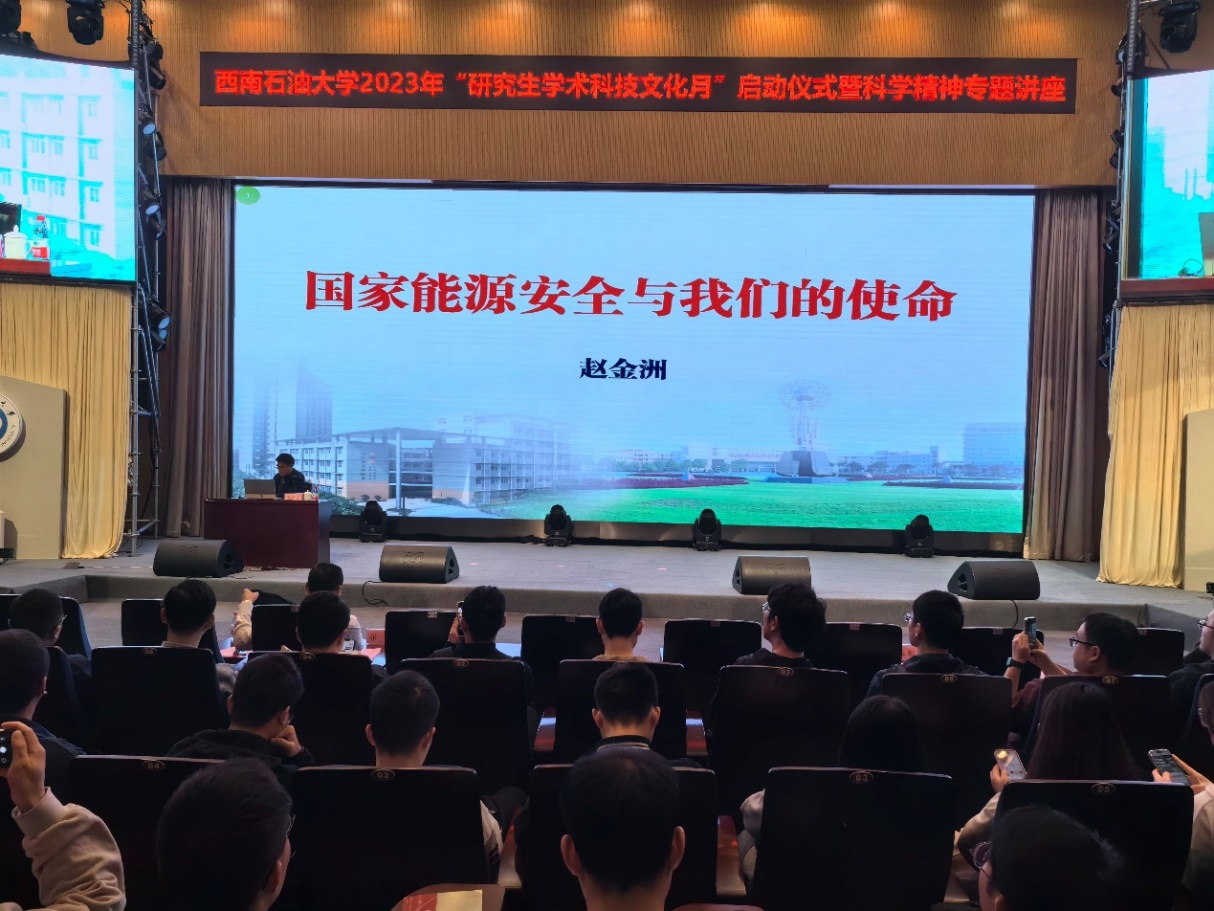 11月2日上午,在校慶65周年之際,為進一步強化研究生的學術創新意識,培養研究生崇尚學術、獻身科學的精神,學校“喜迎校慶?筑夢研途?科創報國”研究生學術科技文化月啟動儀式在圖書館學術報告廳舉行。特邀西南石油大學原校長、油氣藏地質及開發工程全國重點實驗室主任趙金洲出席并作主題報告。黨委學生工作部(處)部長蒲勇,研究生院(一流學科建設辦公室)院長李早元,四川省威沃敦石油科技股份有限公司副董事長段小麗,石油與天然氣工程學院黨委副書記、院長張智,學院黨委副書記、紀委書記錢廣,副院長趙玉龍出席活動,各學院師生代表共400余人參加啟動儀式。