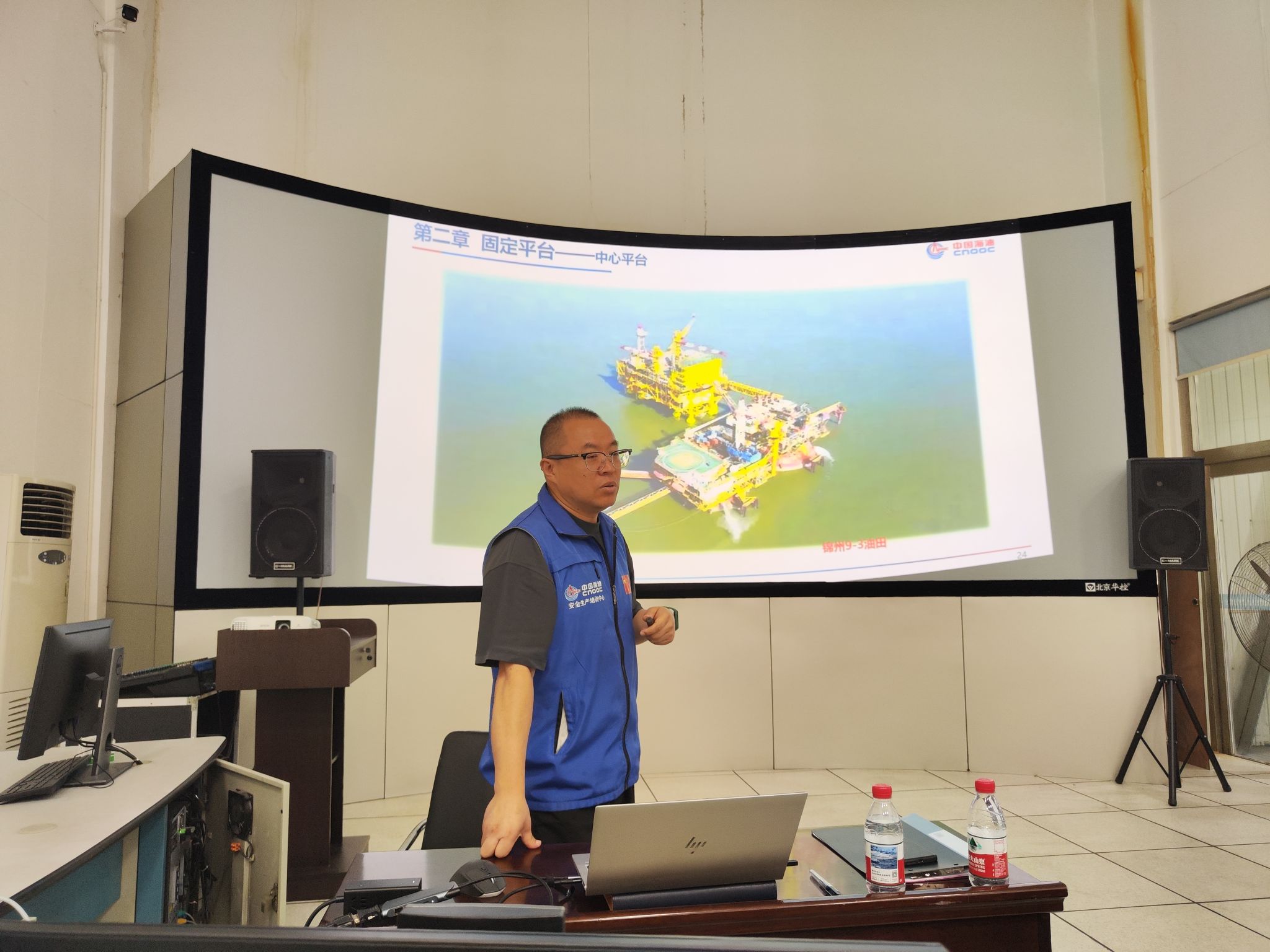 實習開班儀式后,培訓中心劉建濤系統講授了海洋石油生產關鍵內容,涵蓋生產設施開發模式、固定平臺與浮式生產裝置原理及特點。在原油處理系統環節,劉建濤詳細闡釋了分離器及換熱器的運作機制,使學生清晰掌握原油從開采到初步處理的核心流程。