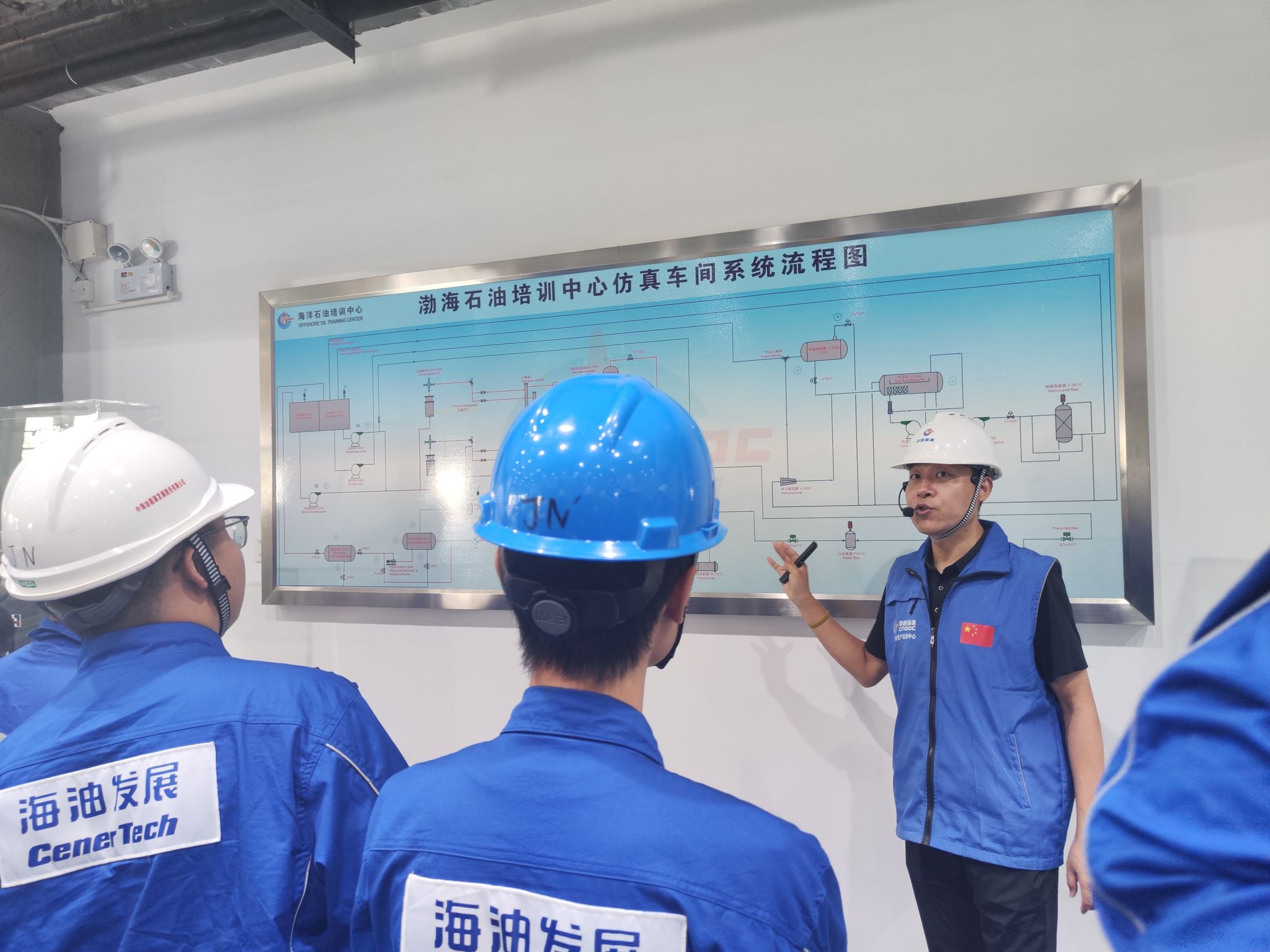資深培訓師穆證榮指導學生深入學習工藝流程圖(PFD)和管道儀表流程圖(PID)。他不僅解析了流程圖的構成要素與符號規范,還結合案例深化學生理解。課堂設置的識圖繪圖練習環節,促使學生積極思考討論,有效轉化理論知識。在仿真車間實踐中,學生們將上午所學的生產設施設備知識與流程圖技能融會貫通,于高度仿真環境中實現理論與工程實踐的無縫對接,對海洋油氣生產流程建立了直觀且深刻的理解。