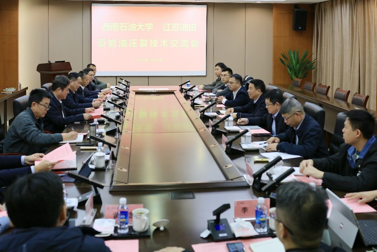 11月25日,校黨委副書記、校長、非常規油氣開采教師團隊負責人郭建春率隊赴中國石化江蘇油田分公司開展技術交流,聚焦蘇北頁巖油開發中的“控規模”與“保產量”的核心難題,推動產學研精準對接。交流會由江蘇油田分公司副總經理周宇成主持。