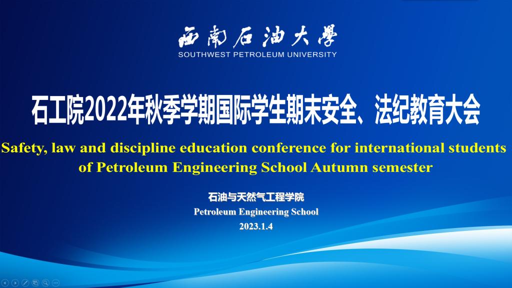 為進一步加強學期末國際學生法紀教育與寒假安全管理,增強國際學生在校行為規范化,1月4日,石工院召開2022年秋季學期期末國際學生安全、法紀教育大會。石工院全體國際學生參會,石工院輔導員李安然主持會議。