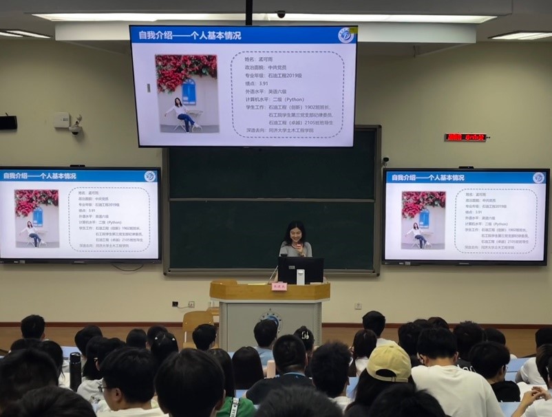 廖鈺朋同學從學習和生活的角度向大家分析了大學與高中差異性,同時詳細解讀了油氣儲運工程專業的學科內涵和范圍,并結合當今國際形勢介紹了目前專業所面臨的機遇與挑戰,希望大家能夠認真學習,不畏困難,扛起重任,為祖國油氣儲運行業“添磚加瓦”。