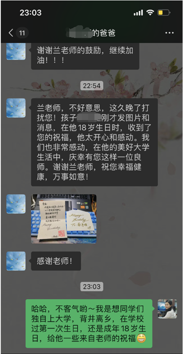 “蘭老師,我家孩子說您為他準備了生日賀卡,非常感謝,很幸運他能成為你的學生。”