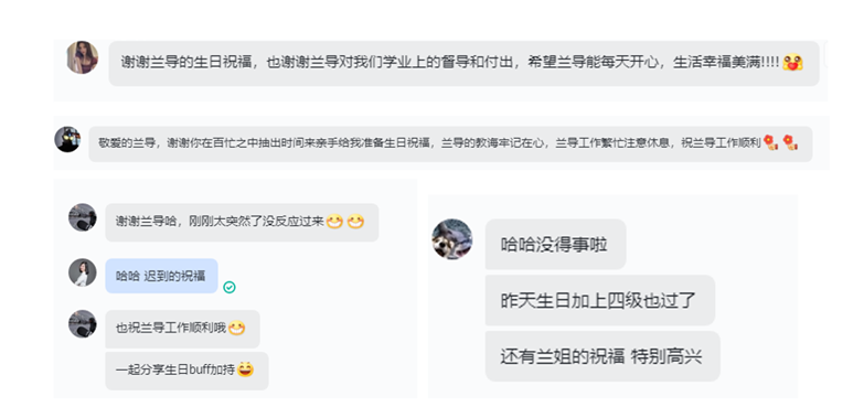 “敬愛的蘭導,謝謝你在百忙之中抽出時間來親手給我準備生日祝福,蘭導的教誨牢記在心,蘭導工作繁忙注意休息,祝蘭導工作順利。”