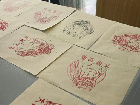 第二模塊即拓印部分。首先主持人介紹拓印的歷史來源,寓意及內涵,向同學們展示拓印作品及雕版。