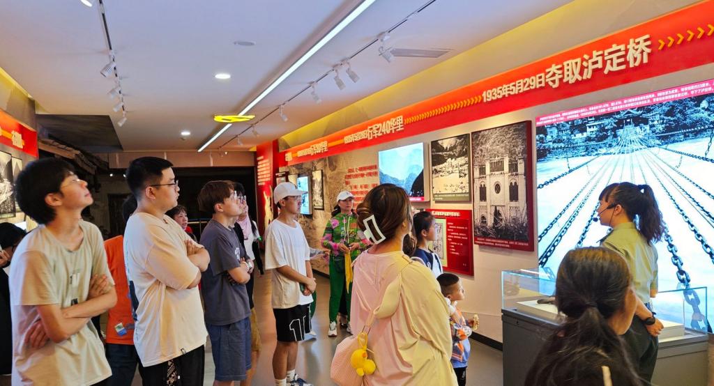 告別了老兵爺爺,接下來尋夢向陽隊前往石棉縣參觀紅軍強渡大渡河紀念館。館外,夏日陽光燦爛,綠樹森森,一切都顯得寧靜美好。而踏入紀念館,便仿佛置身當年的作戰現場。場館中不時響起的炮火音效讓參觀者身臨其境,紅軍從江西開始,穿過重重圍剿,又巧渡金沙江,經過藏區,到達大渡河。展館中展示了VR還原的安順場戰役,船工們自告奮勇,頂著槍火壓力,載戰士過河,奠定了這場戰役的勝利。這次參觀讓隊員們深刻感受到了長征精神,強渡大渡河能夠成功,長征能夠勝利,就是因為這種精神。參觀結束后,尋夢向陽隊在紀念館前宣誓,要牢記長征精神,重溫老一輩的革命足跡,要傳承初心和使命,為實現民族復興的中國夢不斷奮斗。