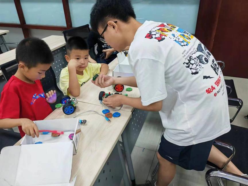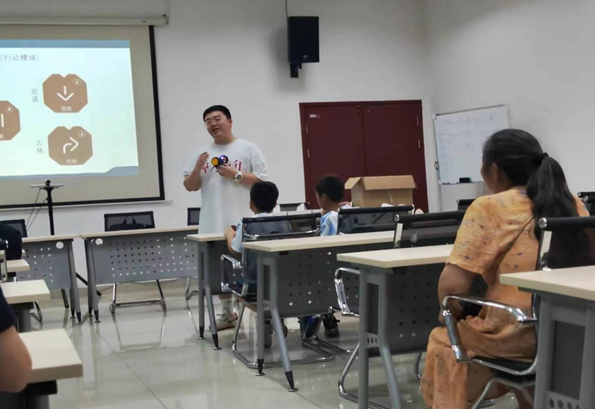 作為一名老師,雖然是臨時的,但他也意識到必須解決這個嚴重的問題。第一節下課,他便積極詢問其他隊員和一些陪伴孩子的家長朋友來獲得一些有利的建議,比如,講課聲音小,不懂得運用一些例子活躍課堂,不應該死板地站在講臺中間一動不動等等。后來的課上明顯有了好的變化,小朋友開始提起精神,注意著授課同學的動作,也積極回答授課同學的問題,像“哪一位小朋友知道用哪些板塊可以使小機器人前行到桌子邊然后轉彎?”隨后就有許多只小手舉起,“老師,我……我……,我會……,我知道……”,小朋友們異口同聲地回答道,課堂一下就“活”起來了。