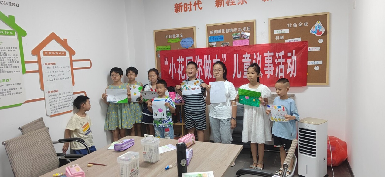 為進一步體現孩子們的想象力與創造力,與本次社區實踐相聯系,實踐隊員們與孩子們一同開展了“小花園你做主”的繪畫議事活動。孩子們的作品展示了他們獨特的想法和創造力,受到了實踐隊員和其他參與者的贊賞和鼓勵。這對孩子們來說是一次重要的成長經歷,激發了他們對藝術的興趣和熱愛。