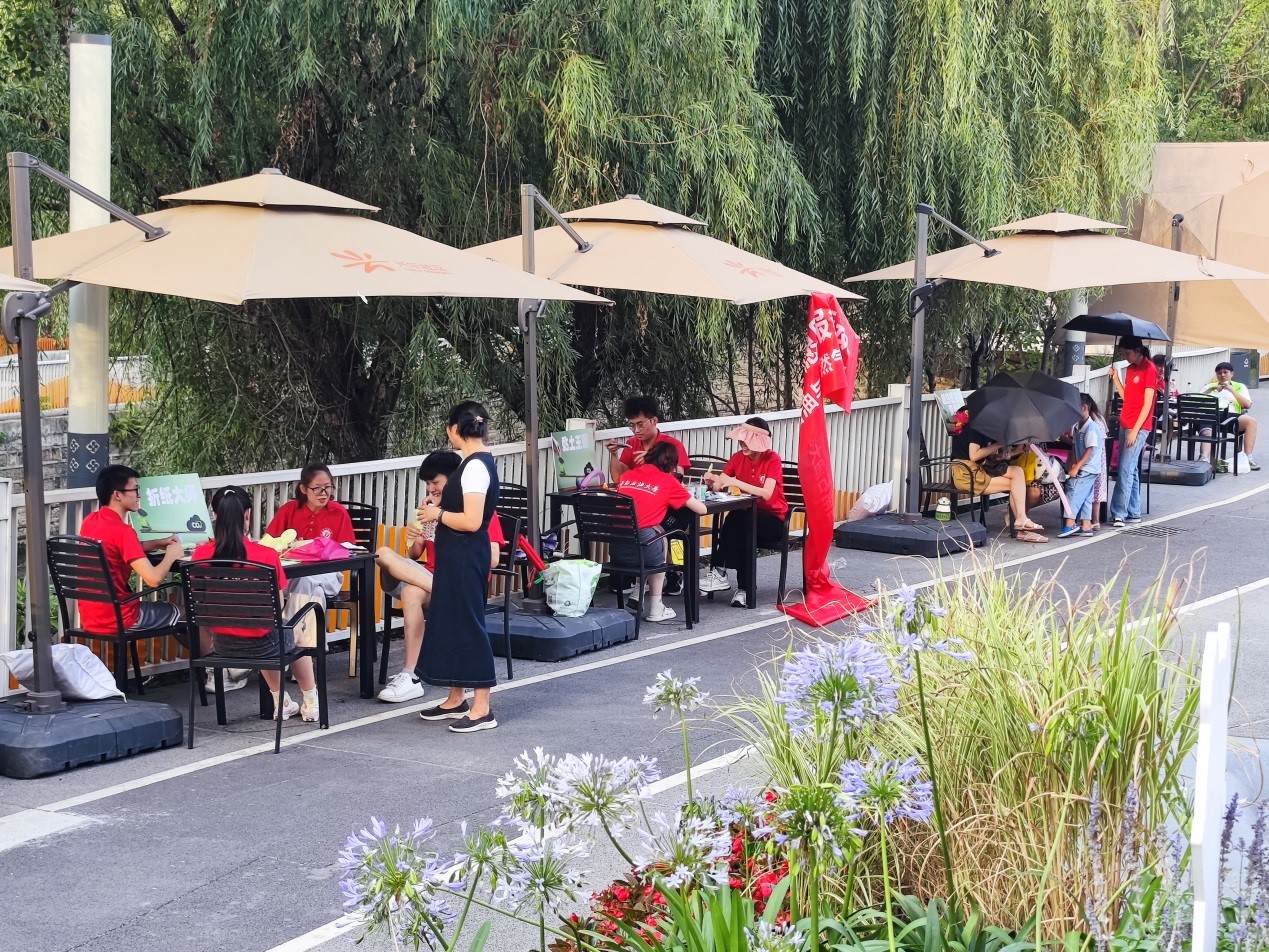圖為實(shí)踐隊(duì)布置游園會(huì)與居民愉悅交流