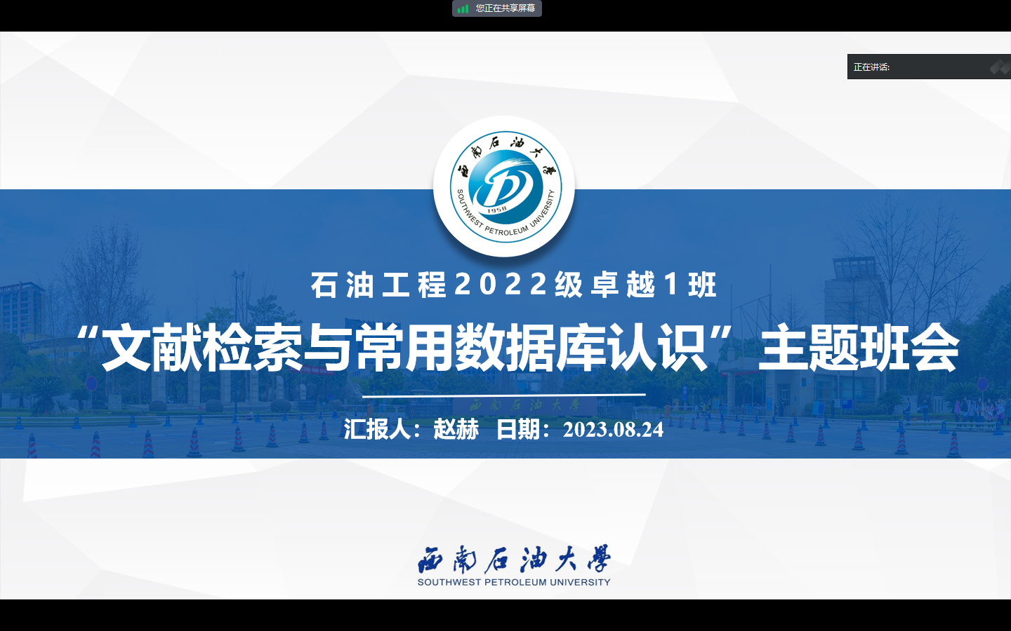 為幫助同學(xué)們了解各類文獻(xiàn)檢索工具,學(xué)習(xí)論文寫作方法,了解圖書館學(xué)術(shù)資源的分布和使用,8月24日,石油工程2022級(jí)卓越1班組織開展線上“文獻(xiàn)檢索與常用數(shù)據(jù)庫認(rèn)識(shí)”的主題班會(huì),此次班會(huì)由趙赫同學(xué)和班導(dǎo)師王超文主持。