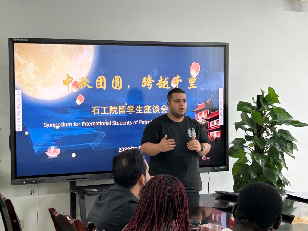 會議伊始,留學生們一同觀看了中秋節相關的英文視頻,了解了中秋節的起源、月餅的文化內涵等。隨后,國際學生代表SACHINI、MELIANA、MUSTAFA分別進行發言,分享自己在蓉、在校期間的學習與生活。SACHINI就自己在校課程學習情況、中文學習情況以及校園社團活動進行了發言。來自印尼的MELIANA用流利的中文講述了她在成都的求學經歷。來自伊拉克振華石油公司的MUSTAFA向同學們分享了SPE成都分部,歡迎各國留學生的加入。