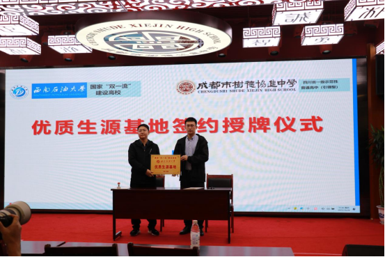 為全面加強招生宣傳工作,深入推進(jìn)優(yōu)質(zhì)生源基地建設(shè),不斷提高生源質(zhì)量。10月26日,石油與天然氣工程學(xué)院青年教師朱蘇陽、招生工作對接人費冬赴成都市樹德協(xié)進(jìn)中學(xué)開展優(yōu)質(zhì)生源基地建設(shè)工作,舉行了優(yōu)質(zhì)生源基地簽約授牌儀式及能源科普講座,并開展高考志愿填報咨詢活動。