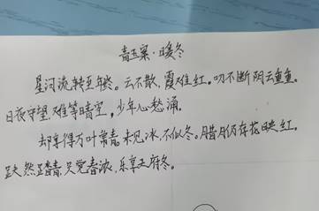 在主持人對活動的流程進行短暫的介紹后,同學們按照部門分組開始了熱烈的討論。同學們奮力施展著自己的文學能力,在字句上反復斟酌,協力創作出一首屬于自己部門的優美詩歌。評選出優勝組后,同學們絲毫沒有沉浸在上一輪的比拼中,反而乘著詩意尚盛,將勁頭傾注到個人詩的創作中。活動在同學們詩意未盡,陶醉于詩影中結束。