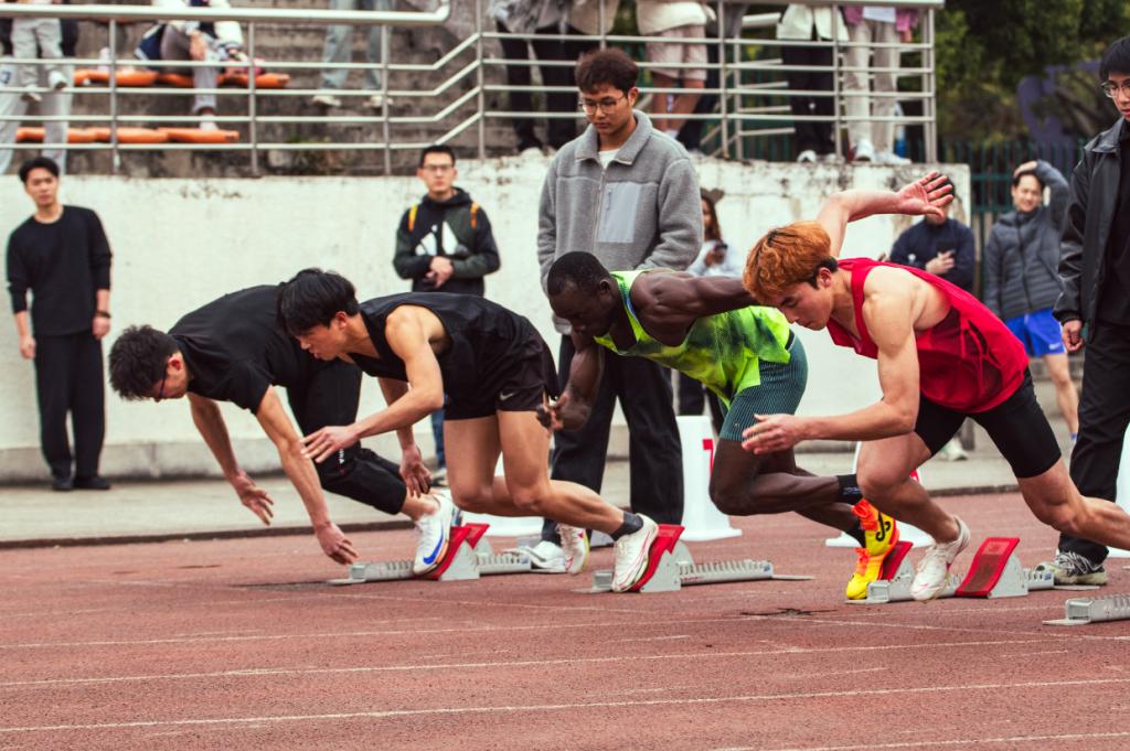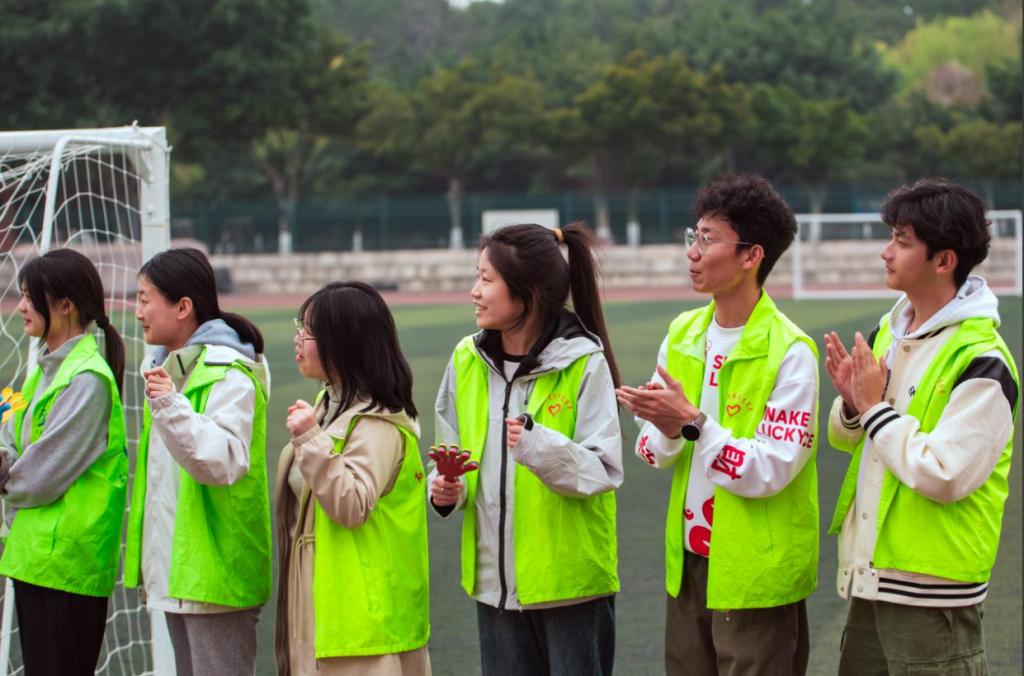 清晨7:30,青志協后勤組的志愿者們已抵達運動場。他們手持清單穿梭于器材室,將川劇變臉表演所需的鼓架、臉譜道具逐一搬運至候場區。“演員的頭飾需要輕拿輕放,第三箱道具標記為‘緊急備用’!”組長通過對講機反復確認。8:20,禮儀組志愿者身著統一制服,在入場處為外國留學生遞上中英文雙語的賽程手冊,并用貼紙區分教工與學生參賽方陣。開幕式后,教職工100米預決賽成為首個高潮。檢錄處志愿者手持名單逐一核對參賽教師信息,為戴眼鏡的教授貼上防滑鼻托,替老教師系緊鞋帶;發令槍響前,2名志愿者跪地檢查每一道跑道的起跑器穩定性。 “張老師,第四道!注意壓線!”賽道旁,志愿者舉著手寫提示牌為沖刺階段的教授們指引方向。在4×100米接力賽中,志愿者在交接棒區域拉起熒光警戒帶,反復提醒圍觀學生保持安全距離。學生賽場上,志愿者的身影與選手們并肩前行。