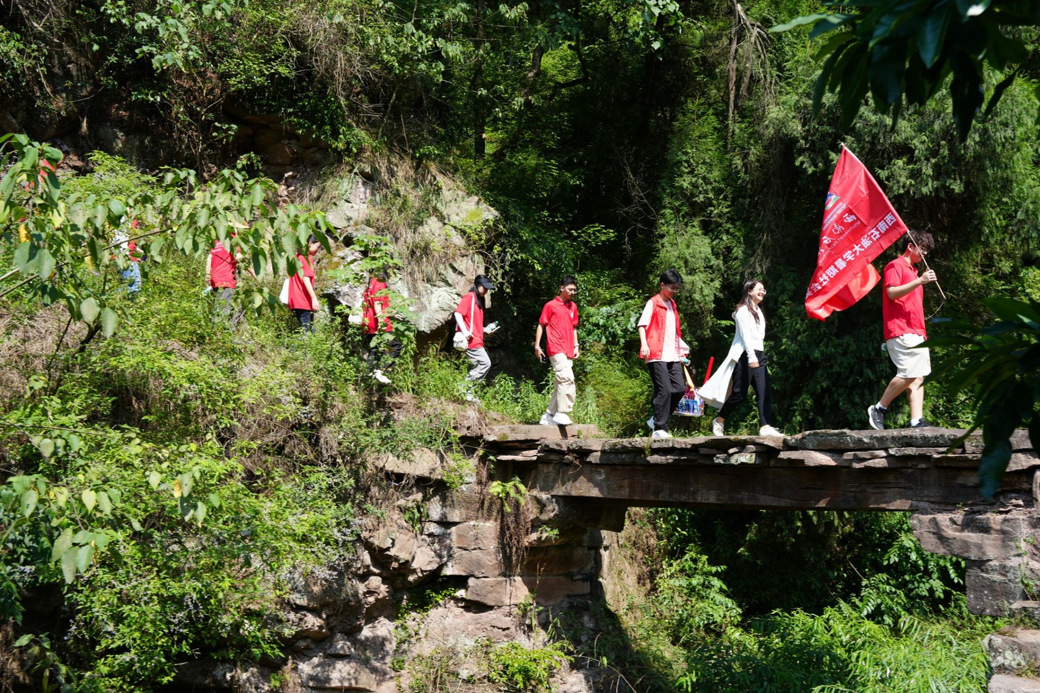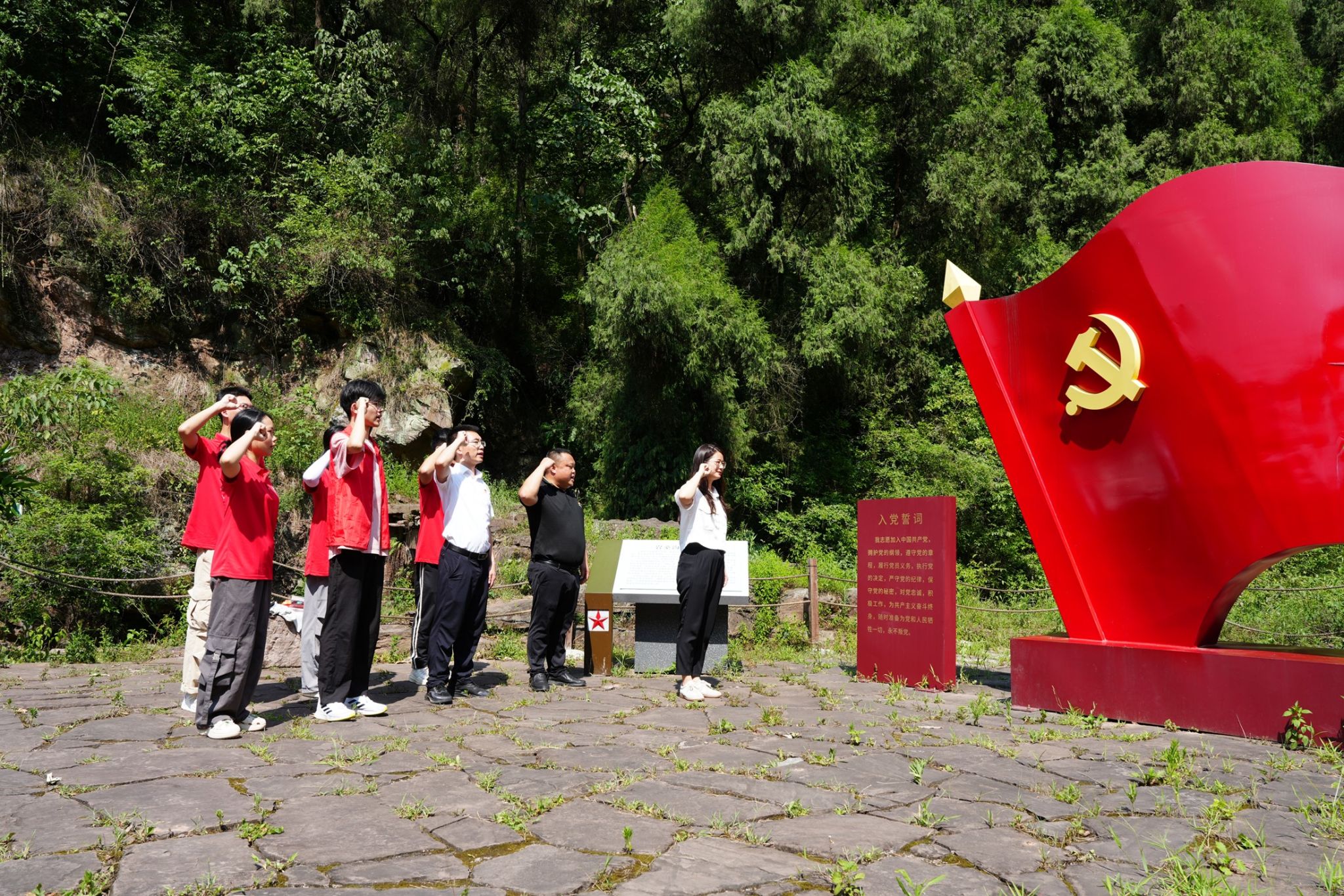 隨后,隊員們沿著小路步行至巖桑溝興橋遺址。這座長約6米、寬約1.3米的木石混合結構橋,雖看似簡陋,卻是毛澤東和中央紅軍長征入川的第一橋。1935年,毛澤東經此橋進入古藺縣,指揮了著名的四渡赤水戰役。站在橋上,隊員們仿佛能看到當年紅軍長征的身影,深刻體會到了那段歷史的厚重。面對黨徽,隊員們莊嚴宣誓。