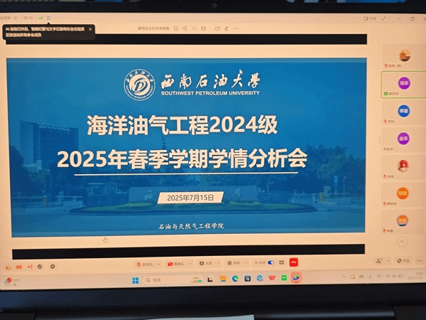 為精準把握學生學習狀態,明確努力方向,2025年7月15日上午,石油與天然氣工程學院2024級海洋油氣工程專業通過飛書會議平臺,成功召開了2025年春季學期線上學情分析會。輔導員張陳月、班導師宋金澤、李駿及全體海油2024級同學齊聚云端,共同回顧總結春季學期的學業情況。