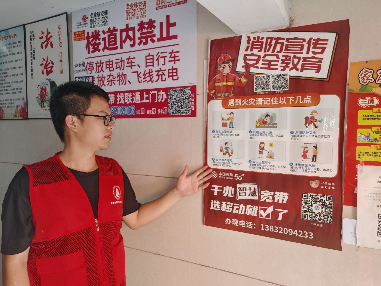 “大爺,柴火堆離灶臺太近容易著火,咱們挪到院子另一側吧。” 在獨居老人張大爺家,志愿者一邊幫忙搬運柴火,一邊講解火災預防知識。為讓消防宣傳更順利,團隊配合當地消防海報進行宣傳教育,并將宣傳海報張貼在公告欄和樓道口。同時,志愿者們走進村民家中,講解油鍋起火處置、電器火災撲救等實用技巧。