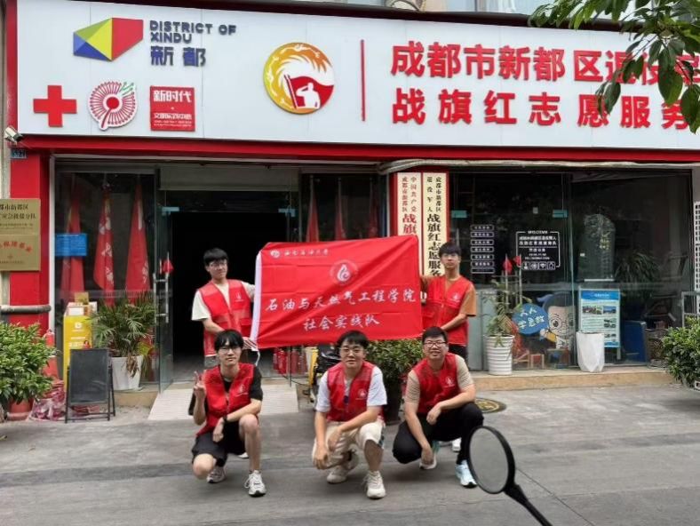 活動尾聲,實踐隊員們身著隊服,手持 “石油與天然氣工程學院社會實踐隊” 旗幟,在志愿服務站前莊重合影。紅色隊服與鮮艷旗幟交相輝映,定格下青春向紅色精神靠攏的瞬間。此次實踐,隊員們不僅近距離觸摸到退役軍人 “奉獻不止、擔當不渝” 的精神脈搏,更在實操中練就服務社會的本領。