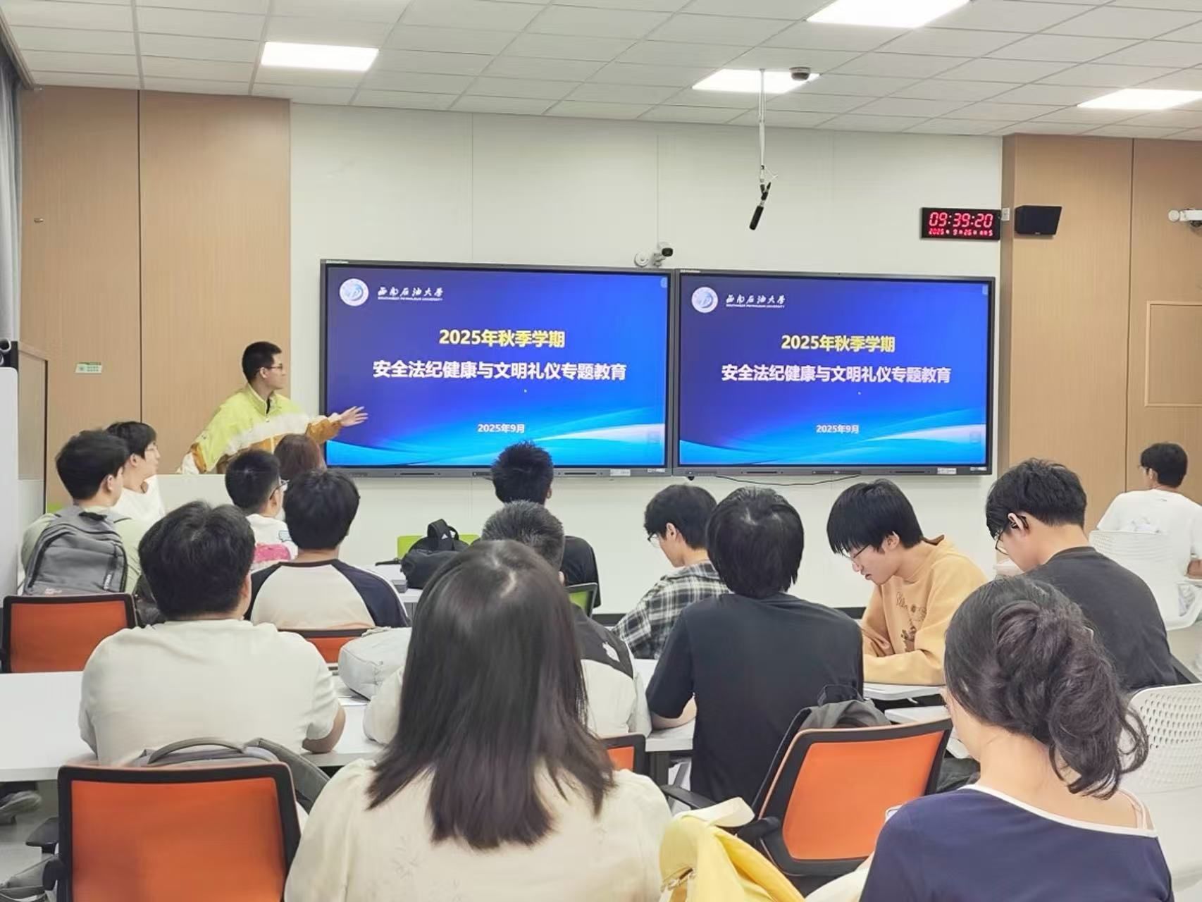2025年9月26日上午,2023級油氣儲運工程專業5班全體同學在明理樓B305教室開展“安全法紀健康與文明禮儀專題教育”主題班會,旨在強化同學們的安全意識、法紀觀念、健康素養與文明修養。