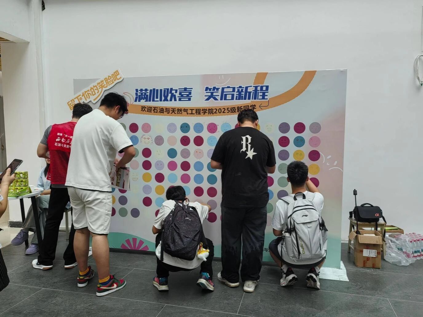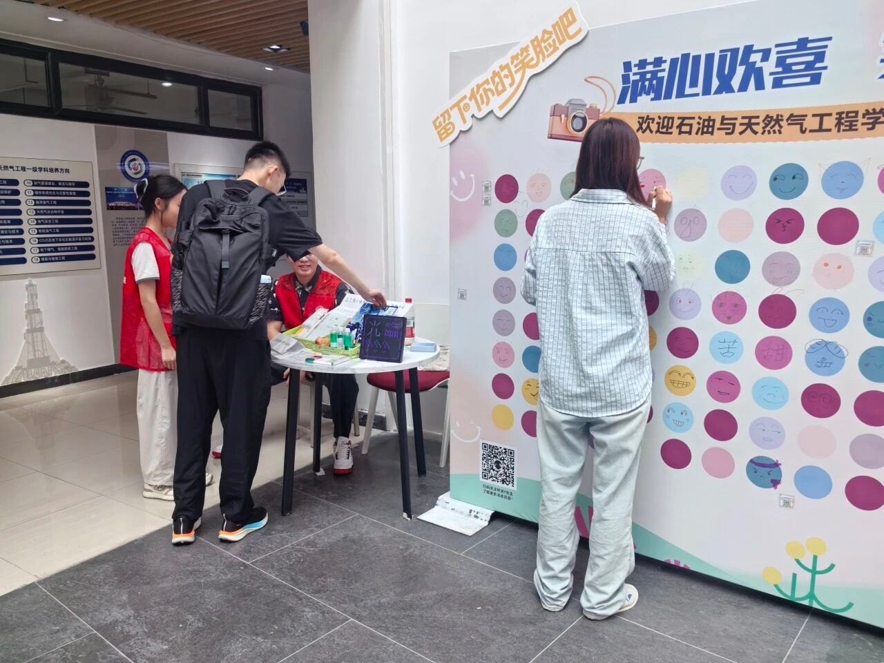 活動前期,心理服務站團隊提前籌備,在活動現場布置了專屬 “心情涂鴉墻”,并準備了色彩豐富的彩筆、馬克筆等繪畫工具,同時精心挑選了包含心理健康手冊、解壓小玩具的迎新禮品包,從細節處傳遞關懷?;顒悠陂g,工作人員主動向過往新生介紹活動規則,引導大家通過手繪表情的方式,將初入校園的緊張、期待、好奇等復雜心情直觀呈現在涂鴉墻上 —— 有的新生畫下咧嘴笑的太陽表情,表達對大學生活的憧憬;有的用柔和的色彩勾勒微笑的云朵,傳遞內心的輕松;也有同學通過簡單的線條畫出略帶羞澀的表情,展現初來乍到的拘謹。完成涂鴉后,新生可領取專屬禮品,現場氛圍溫馨活躍。