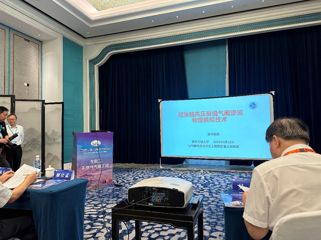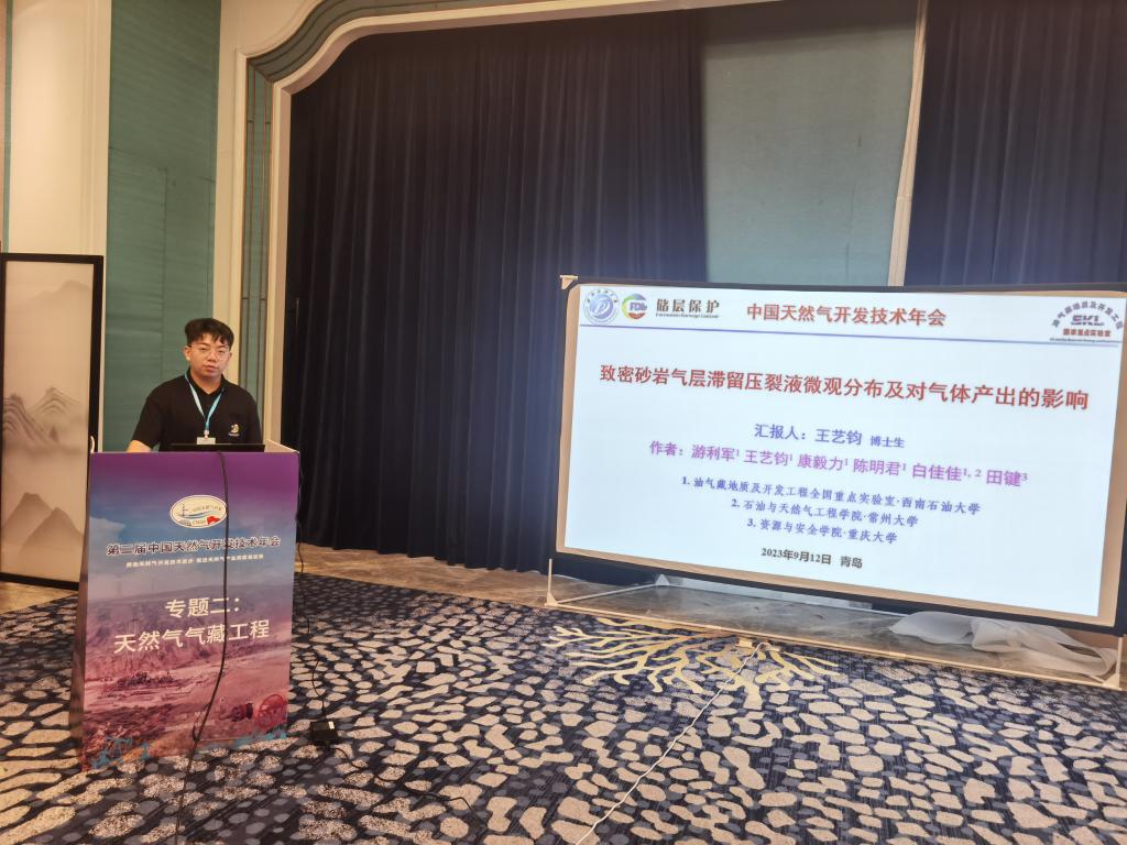 趙金洲教授作了題為《深層頁巖氣壓裂技術挑戰和發展方法》的主會場特邀報告,從中美頁巖氣發展對比以及深層頁巖氣壓裂十大特征、六大難題、十大發展方向等方面進行了深刻剖析。郭平教授作了題為《超深超高壓裂縫氣藏滲流物理模擬技術》的分會場主題報告,介紹了其研究團隊在大模型滲流實驗裝置研制、超高溫高壓滲流實驗評價方法、裂縫儲層巖心制造、含水飽和度建立等方面取得的核心技術以及已獲授權的發明專利,獲優秀報告一等獎。王藝鈞作了題為《致密砂巖氣層滯留壓裂液微觀分布及對氣體產出的影響》的分會場主題報告,以3類富含不同黏土礦物類型的致密砂巖氣藏為例,從多尺度、多手段的角度揭示了滲吸/返排階段壓裂液滯留時空多尺度分布及對氣體產出的影響,從氣-水分布演化與滲流能力響應特征角度探索提出“水患”防控的新理念,獲年會優秀報告一等獎。
