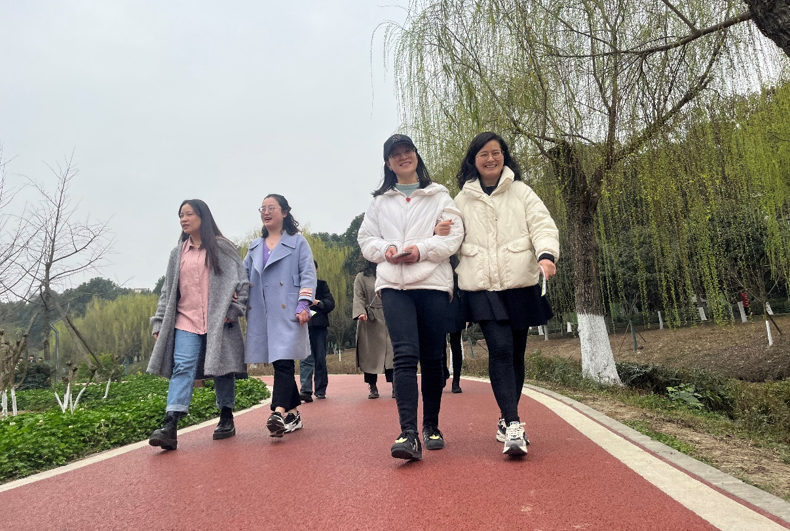 參加活動的教職工首先在游泳池旁領(lǐng)取活動券,然后沿夢溪健身步道向校園北門行進(jìn),最后抵達(dá)活動終點(diǎn)明辨樓B區(qū)1樓,簽字并提交活動券。三月的校園,春風(fēng)拂去冬日的陰霾,大地披上綠色的新裝。老師們在欣賞美麗校園春光的同時,或三倆結(jié)伴,或組隊前行,呼吸著新鮮的空氣,享受著運(yùn)動的快樂,營造出健康向上的校園氛圍。