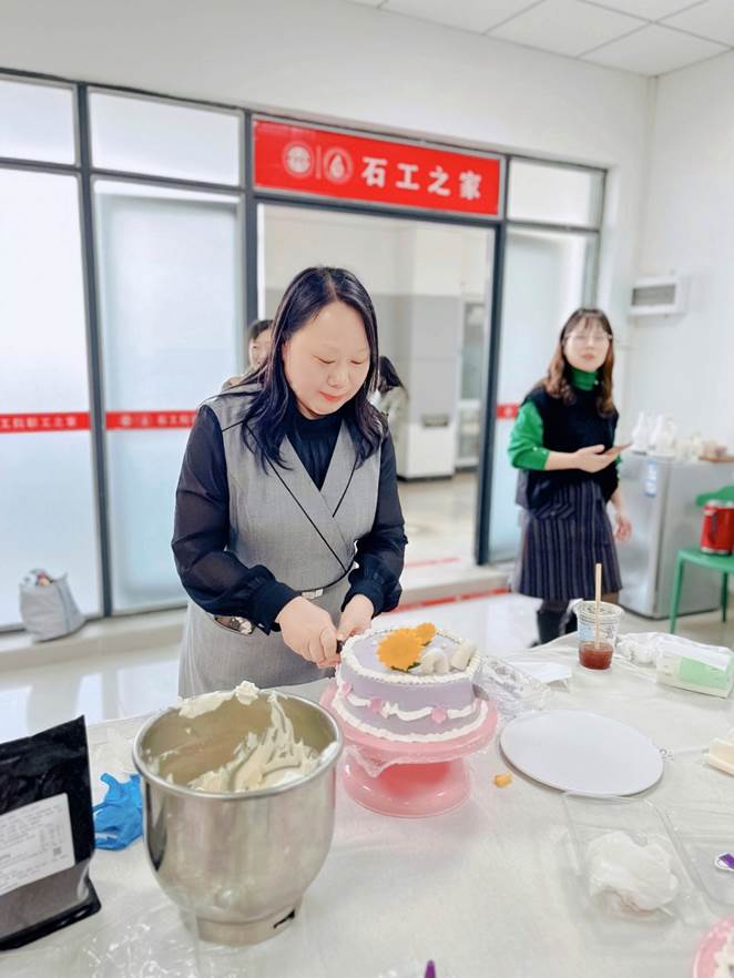 在石工之家交流區,一盞清茶、一杯咖啡、一塊點心、一份水果,拉開了春日下午茶的帷幕。老師們一邊聊天一邊品嘗各式精美茶點。蛋糕DIY環節,在烘焙老師的講解指導下,參與體驗的老師們現學現做,在蛋糕胚上抹奶油、放水果、裱花裝飾,制作出各具創意的“郁見幸福”鮮奶蛋糕、“欣欣向上”水果蛋糕、“喜氣洋洋”夾心蛋糕,營造出歡樂溫馨的節日氛圍。