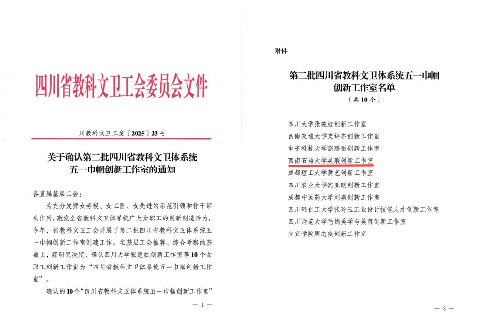 近日,四川省教科文衛工會委員會發布《關于確認第二批四川省教科文衛體系統五一巾幗創新工作室的通知》(川教科文衛工發〔2025〕23號),西南石油大學“吳瑕創新工作室”成功入選,成為全省教科文衛體系統獲此殊榮的10個優秀女職工創新團隊之一。該工作室將獲得省教科文衛工會一次性專項經費補助1萬元。