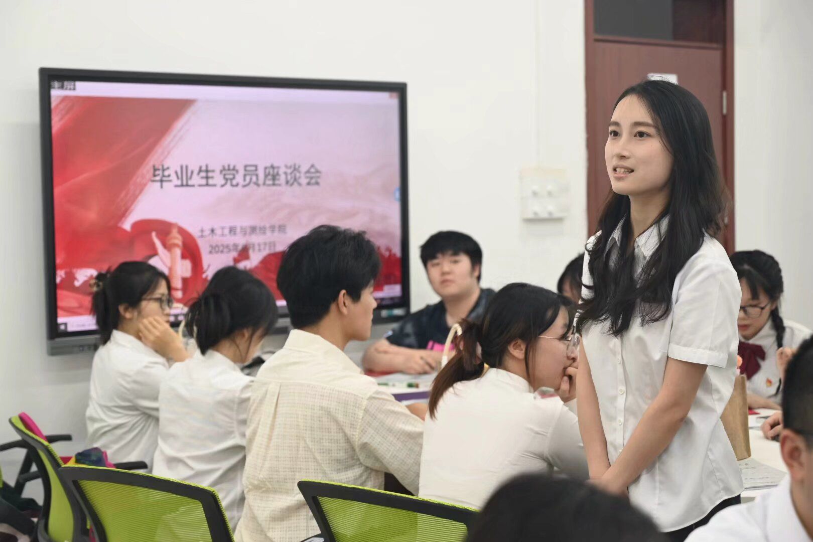 為推進黨建與人才培養深度融合,進一步強化黨建對畢業生黨員發展的引領作用。6月17日,土木工程與測繪學院(南充)于第三教學樓3111教室組織召開2025屆畢業生黨員座談會。學院副院長潘海澤及三位學生黨支部書記參與。