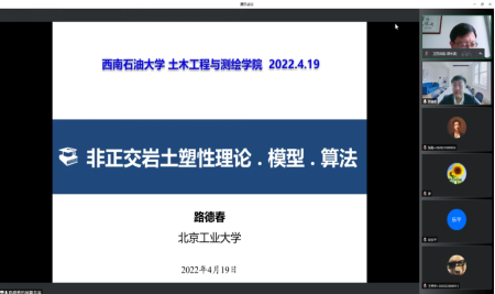 4月19日上午,我院邀請北京工業大學路德春教授、國家杰青為我院師生作“非正交巖土塑性理論、本構模型及算法”線上專題學術講座。路德春教授主要從事巖土與城市地下工程領域的研究,現任北京工業大學城市建設學部副主任、巖土與地下工程研究所所長,兼任中國巖石力學與工程學會青年工作委員會副主任委員、《巖土工程學報》編委、《北京工業大學學報》副主編/青年編委會主任等。本次講座由我院院長邵永波教授主持。