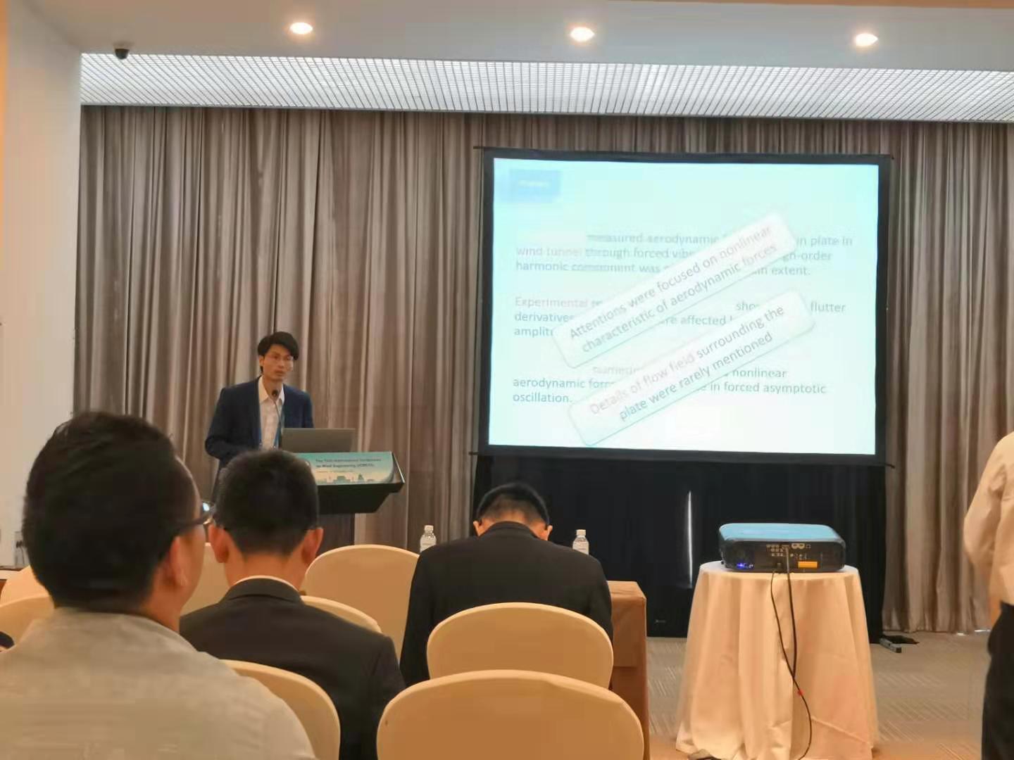大會設立6個分會場,與會專家學者分別開展專題報告交流。在“Wake Flow”專題研究分會場,我院青年教師唐煜作了題為“Numerical study of the flow over a thin plate in harmonic oscillations”的學術報告,土木工程專業(yè)碩士研究生胡攀作了題為“Study on buffeting responses of a single tower cable-stayed bridge under double cantileverconstruction”的學術海報展示,研究成果得到與會專家的充分肯定與熱烈討論。(建筑工程教研室 2017級碩士生 胡攀 圖/文)