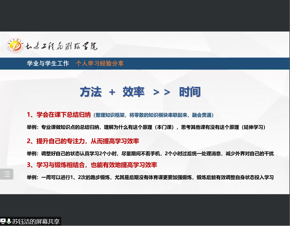 在分享之初,蘇鈺潔給全體2022級(jí)新生介紹了她在學(xué)校、學(xué)院擔(dān)任的職務(wù)與工作實(shí)踐,分享了如何處理學(xué)業(yè)和學(xué)生工作,取得兩者的平衡發(fā)展。接著,她著重分享了一些她的學(xué)習(xí)經(jīng)驗(yàn),提到:在大學(xué)里,目標(biāo)尤為重要,一個(gè)自主學(xué)習(xí)的習(xí)慣,一個(gè)良好的作息等都會(huì)給大學(xué)生活帶來(lái)不小的益處;其次就是在學(xué)習(xí)上,一定要注意學(xué)習(xí)方法,方法加效率是大于時(shí)間的。做好了學(xué)業(yè)和學(xué)生工作之間的時(shí)間管理,對(duì)自己的綜合能力提升也會(huì)有很大的幫助。