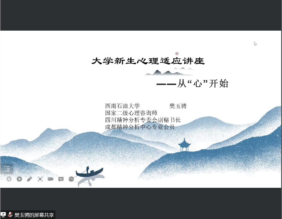 主講人簡(jiǎn)介:樊玉騁,講師,碩士,學(xué)校心理發(fā)展與服務(wù)中心專職心理健康教師,國(guó)家二級(jí)心理咨詢師,成都精神分析中心專業(yè)會(huì)員。擅長(zhǎng)采用精神分析取向開展人際、情感等問(wèn)題的咨詢。