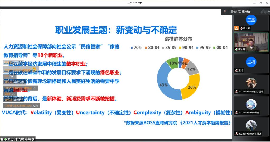 張亦弛,男,漢族,中共黨員。西南石油大學招生就業處大學生職業規劃指導中心主任 ,教育部24365就業指導直播課主講教師,NCDA CDI生涯發展講師(督導),國家三級心理咨詢師,GCDF全球職業規劃師,BCC國際生涯教練,全國生涯規劃專家,“智匯巴蜀”大學生職業指導專家庫四川專家。獲批2022年四川省就業創業金課一項,曾獲四川省首屆大學生職業發展與就業指導課程教學大賽一等獎,四川省高校教師教學創新大賽二等獎。長期從事青年職業生涯規劃及心理發展教學工作,開展網絡答疑,撰寫相關專欄,閱讀量超過100萬。