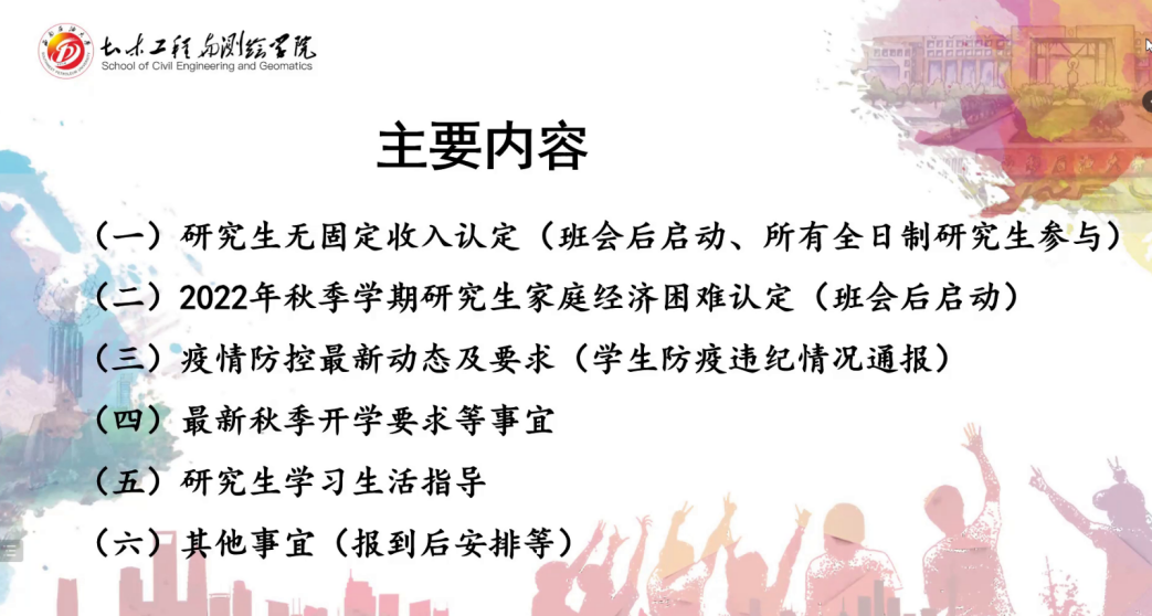 為幫助2022級研究生新生盡快了解并適應新階段的學習,9月10日上午,我院開展了2022級研究生新生開學線上班會。本次班會由土測院研究生輔導員陳偉主持,全體2022級碩士研究生新生參加。