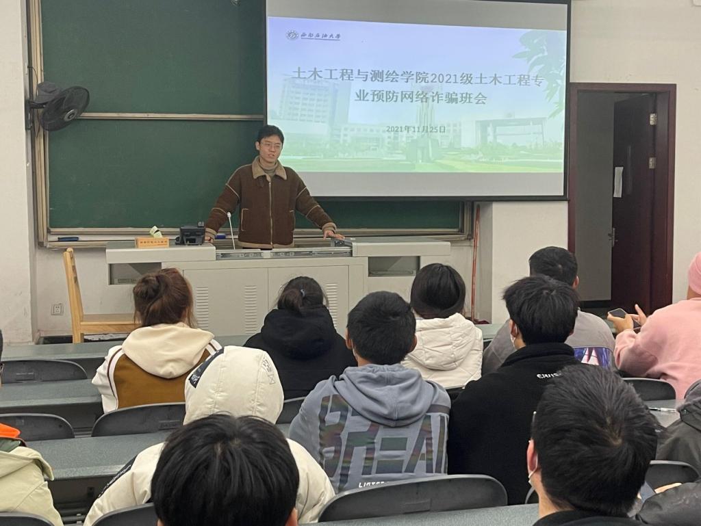 為了提高土木工程與測繪學院學生安全防范意識,杜絕校園網絡詐騙情況的發生,2021年11月25日,土木工程與測繪學院組織了預防網絡詐騙班會。