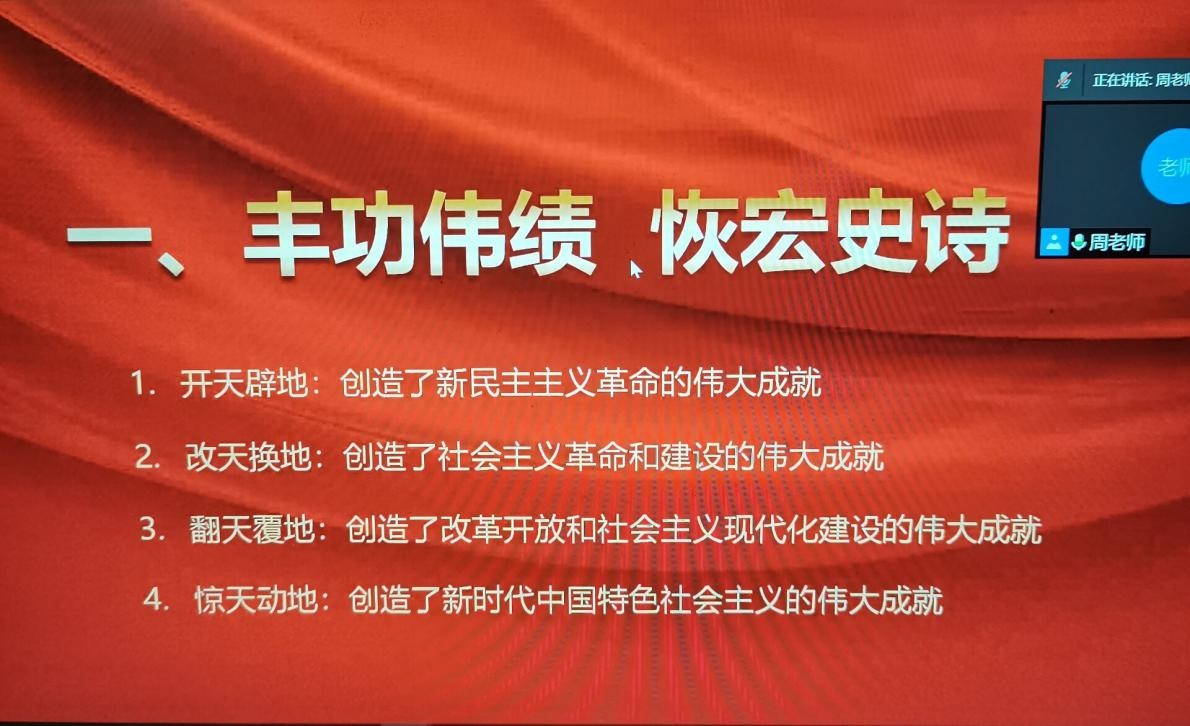 周永華老師談到:“此次入黨積極分子培訓會旨在深化黨的基本理論、基本路線、基本綱領和基本經(jīng)驗教育,進一步提高入黨積極分子的黨的基礎理論素養(yǎng)。”緊接著,他從黨創(chuàng)造了新民主主義革命的偉大成就、創(chuàng)造了社會主義革命和建設的偉大成就、創(chuàng)造了改革開放和社會主義現(xiàn)代化建設的偉大成就、創(chuàng)造了新時代中國特色社會主義的偉大成就四個方面向同學們介紹了黨的豐功偉績。最后,周老師要求同學們堅持中國共產(chǎn)黨的領導,帶領中國人民不斷為美好的生活而奮斗、繼續(xù)推進馬克思主義中國化,發(fā)展中國特色社會主義、加強中華兒女大團結(jié),不斷推進黨建設新的偉大工程。