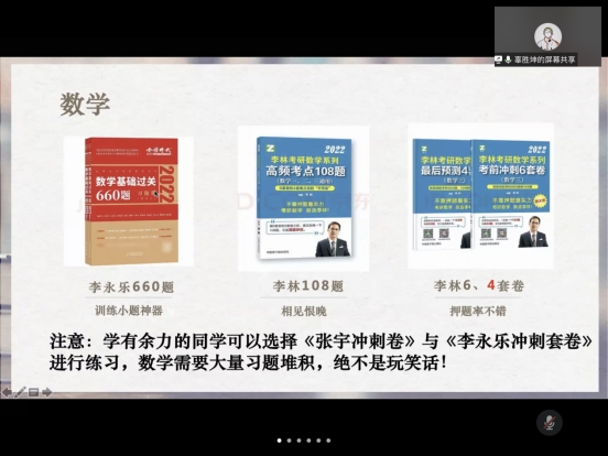“把握時間,夯實基礎。”楊洪鑫學長來自2019級建筑環境與能源應用專業,第一志愿報考同濟大學,現已調劑至上海大學攻讀碩士研究生。面對同學們的擇校問題和復習問題楊洪鑫學長都一一做出了回答,特別是在數學復習方面給出了相當實用的方法和經驗,“武忠詳的660題和《李林沖刺卷》非常值得一做,學有余力的同學到后期還可以做《張宇沖刺卷》和《李永樂沖刺卷》。”不要因考研而荒廢專業學習,楊洪鑫學長強調做好考研復習與課程學習的時間規劃,同時為復習時間緊張而焦慮的同學給出了具體建議,完成當下每一天設立的目標,堅持便是勝利。
