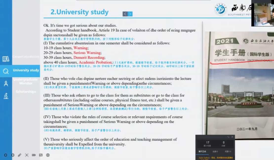 為進一步加強新學期國際學生法紀教育與日常安全管理,增強土測院國際學生在校行為規范化,9月10日晚,土測院在釘釘平臺召開國際學生2021年秋季學期安全及法紀校規教育大會。土測院國際學生輔導員陳偉主持會議,全體國際學生參會。