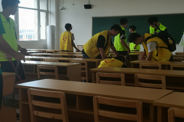 下午四點二十,志愿者們在明志樓下集合簽到,穿上志愿者馬甲,拍完合照后進行分工,在保潔阿姨的帶領下,他們拿上掃除工具邁著激昂的步伐前往明志樓A區二樓清掃教室,志愿者們積極清理垃圾,不怕臟,不喊累,相互配合著。打掃完二樓后,志愿者們又前往明志樓五樓進行清掃,他們將抽屜里、桌子上的垃圾清理得干干凈凈。志愿者用自己的實際行動為學校增添一份清新,陽光下,滴滴的汗水掛在他們自豪燦爛的臉龐上,通過他們辛勤的努力,一個美麗潔凈的校園再次出現在我們面前。最后,此次活動取得了顯著的成效并獲得保潔阿姨們的紛紛贊揚。