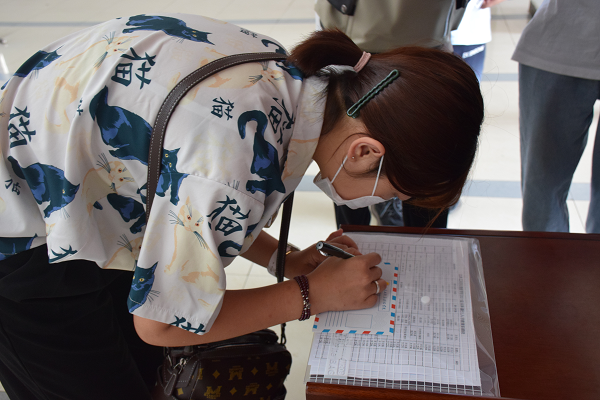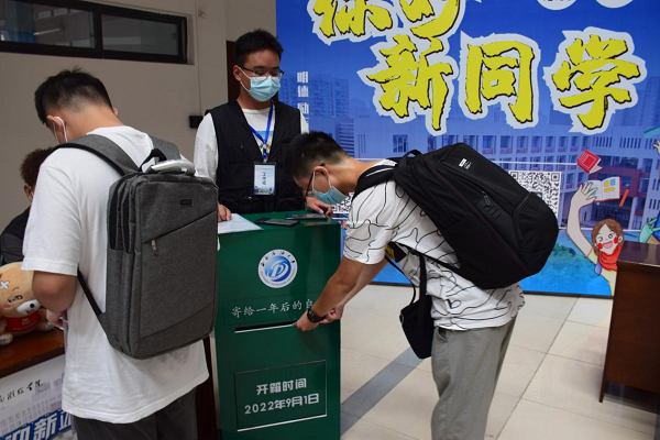隨著新生陸陸續(xù)續(xù)的到來,土測院值班志愿者迅速幫助他們寄存行李,并引導(dǎo)新生進(jìn)行測量體溫、領(lǐng)取明信片、注冊報(bào)到、領(lǐng)取校園一卡通、填寫個(gè)人信息等一系列入學(xué)手續(xù)。除此之外,跟隨新生的步伐不難發(fā)現(xiàn),今年的迎新活動(dòng)還添加了許多個(gè)性化活動(dòng)。在簽到墻上簽下自己的名字,為以后每日的按時(shí)打卡簽到埋下深深的種子;在鏡子前整理著裝,以全新的姿態(tài)進(jìn)入大學(xué)生活;執(zhí)筆一句送給一年后的自己,這不僅是一份祝福更是一份對未來生活的期待。其后就是個(gè)人徽章領(lǐng)取,包括“我是學(xué)霸”、“我是吃貨”、“我是旅行家”、“我是探索家”四個(gè)方面,讓同學(xué)們從自己的興趣愛好出發(fā),更清晰的了解自己大學(xué)可以發(fā)展的方向。