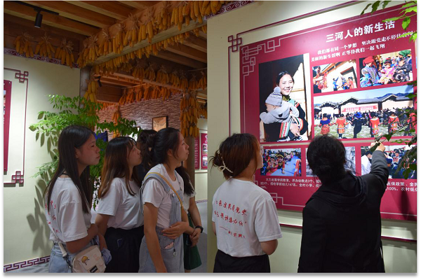 下午,實踐隊采訪了三河村扶貧干部李凱書記,坐在充滿彝族文化氣息的接待廳里,實踐隊與李凱書記交流了三河村的扶貧經(jīng)歷和感受,他說到:“我很開心這里能因為自己的一份力脫貧走向小康,其實脫貧攻堅是每個人的責任,將來鄉(xiāng)村振興也是每個人的使命,大學生應(yīng)該以史為鑒,不斷奮斗,將個人的理想融入國家的事業(yè)中,要銘記昨天的成就,記住今天的使命和創(chuàng)造明天的輝煌。”接著,實踐隊參觀了村史館,見證了三河村在中國共產(chǎn)黨的帶領(lǐng)下一步步脫貧到小康的歷史痕跡。“習近平總書記卡莎莎,彝家新居瓦吉瓦”,這是三河村對習近平總書記、對黨和國家的感激,也是對每個為民族復興、人民幸福奮斗在第一線的共產(chǎn)黨人的感謝。