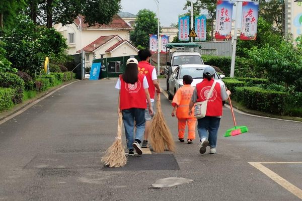 圖為志愿者跟隨環(huán)衛(wèi)工人前往工作區(qū)域