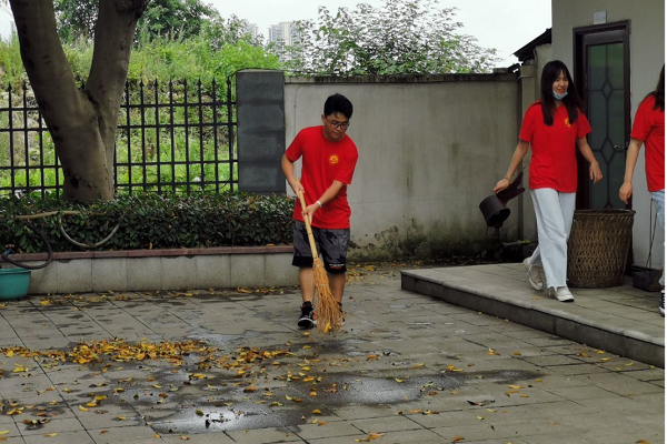 7月12日,實踐隊全體隊員在陵園門口集合,確認好人數和打掃工具后,一同出發前往活動地點。正式活動時,前往提前分好的場地打掃落葉,撿拾垃圾。期間,隊員們拿著塑料袋和掃帚等打掃工具,認真打掃每一個地方。