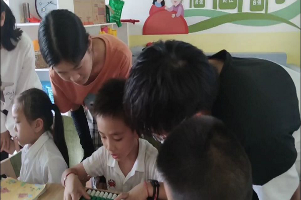 實踐隊于上午九點鐘到達濂溪村村委會,在召集該村8名留守兒童后,隨后開始了當天的實踐內容。隨著對孩子們進行短暫的學業提問后,實踐隊發現,這幾名孩子的學習方面存在一定困難。在看了他們暑假作業的完成情況后,實踐隊決定分兩部分進行實踐:一部分是對孩子們的暑假作業進行答疑,涵蓋語文數學兩個學科。