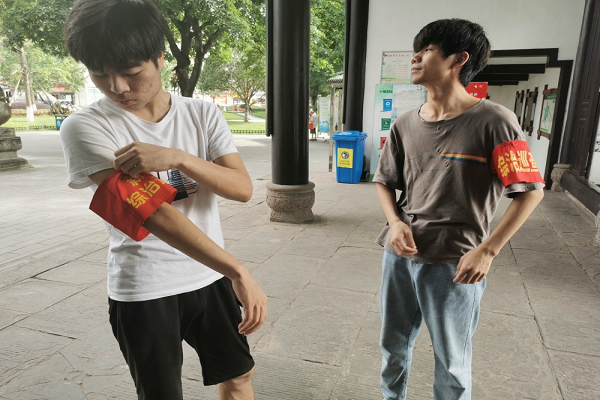 新都桂湖森林公園水域面積較大,不時(shí)會(huì)有人員洗腳以及捕魚撈蝦,治安巡邏的任務(wù)就是對(duì)這些行為加以制止,。7月11日,實(shí)踐隊(duì)在公園管理處領(lǐng)取了袖章,便開始了實(shí)踐活動(dòng),實(shí)踐隊(duì)分為三個(gè)小隊(duì),分別進(jìn)行公園治安維護(hù),門崗執(zhí)勤以及公園垃圾清掃,每隔三小時(shí)換一次崗,輪流進(jìn)行不一樣的任務(wù)。